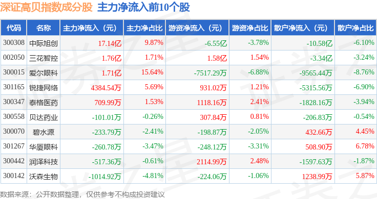 资金流向方面,深证高贝(399662)指数成份股当日主力资金净流出合计194.73亿元,游资资金净流入合计41.99亿元,散户资金净流入合计152.75亿元。成份股资金流向详情见下表: