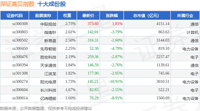 证券之星消息,10月17日,深证高贝(399662)指数报收于2225.64点,跌3.96%,成交2289.72亿元,换手率3.03%。当日该指数成份股中,上涨的有5家,中际旭创以1.81%的涨幅领涨,下跌的有95家,阳光电源以10.91%的跌幅领跌。