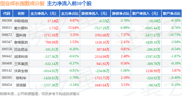 资金流向方面,创业成长(399667)指数成份股当日主力资金净流出合计95.08亿元,游资资金净流入合计25.35亿元,散户资金净流入合计69.73亿元。成份股资金流向详情见下表: