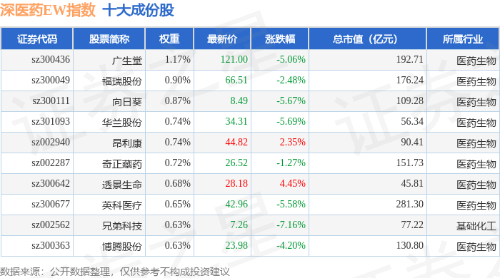 证券之星消息,10月17日,深医药EW(399676)指数报收于3788.84点,跌1.47%,成交555.67亿元,换手率2.55%。当日该指数成份股中,上涨的有30家,华兰疫苗以9.8%的涨幅领涨,下跌的有185家,兄弟科技以7.16%的跌幅领跌。