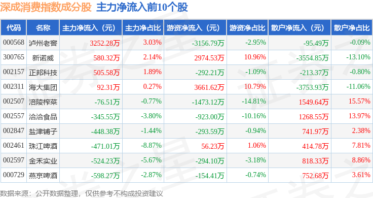资金流向方面,深成消费(399684)指数成份股当日主力资金净流出合计6.31亿元,游资资金净流入合计8602.55万元,散户资金净流入合计5.45亿元。成份股资金流向详情见下表: