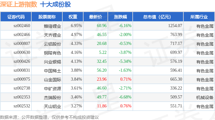 证券之星消息,10月17日,深证上游(399704)指数报收于5794.32点,跌2.54%,成交620.35亿元,换手率3.61%。当日该指数成份股中,上涨的有9家,湖南白银以4.28%的涨幅领涨,下跌的有41家,杰瑞股份以6.68%的跌幅领跌。