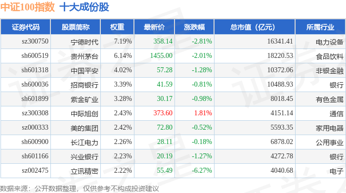 证券之星消息,10月17日,中证100(399903)指数报收于4356.54点,跌2.32%,成交3262.69亿元,换手率0.87%。当日该指数成份股中,上涨的有8家,中金黄金以2.21%的涨幅领涨,下跌的有89家,阳光电源以10.91%的跌幅领跌。