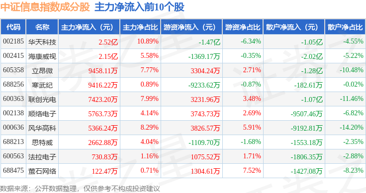 资金流向方面,中证信息(399935)指数成份股当日主力资金净流出合计241.6亿元,游资资金净流入合计77.25亿元,散户资金净流入合计164.36亿元。成份股资金流向详情见下表: