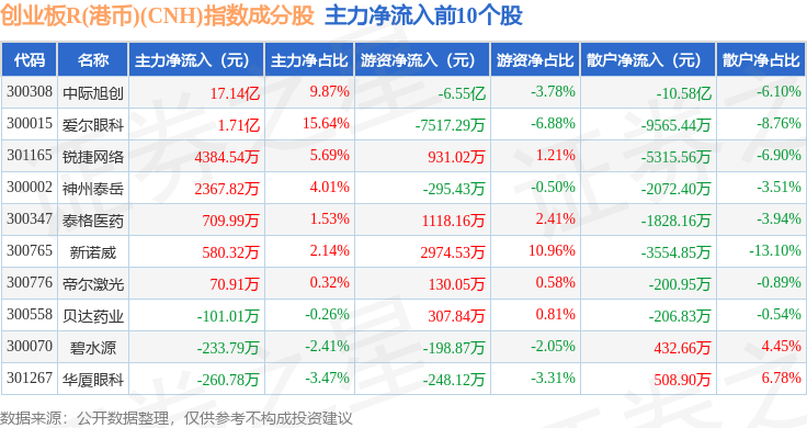 资金流向方面,创业板R(港币)(CNH)(470006)指数成份股当日主力资金净流出合计132.24亿元,游资资金净流入合计31.86亿元,散户资金净流入合计100.38亿元。成份股资金流向详情见下表: