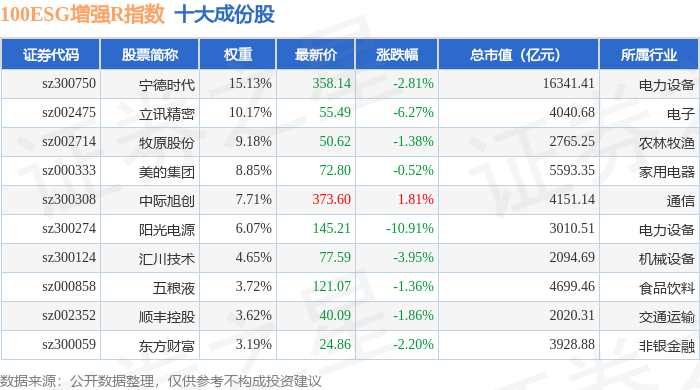 资金流向方面,100ESG增强R(470033)指数成份股当日主力资金净流出合计100.89亿元,游资资金净流入合计31.09亿元,散户资金净流入合计69.81亿元。成份股资金流向详情见下表: