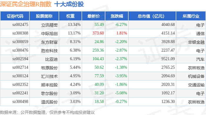 深证民企治理R(470058)指数十大成份股详情如下: