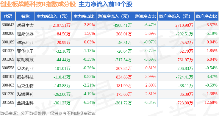 资金流向方面,创业板战略科技R(471004)指数成份股当日主力资金净流出合计34.21亿元,游资资金净流入合计6.92亿元,散户资金净流入合计27.29亿元。成份股资金流向详情见下表: