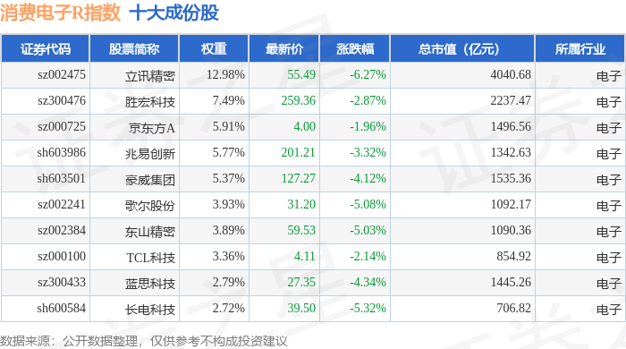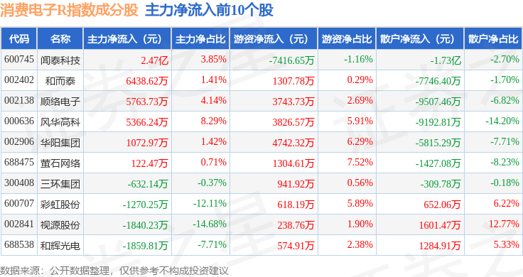 资金流向方面,消费电子R(480030)指数成份股当日主力资金净流出合计92.06亿元,游资资金净流入合计29.13亿元,散户资金净流入合计62.93亿元。成份股资金流向详情见下表: