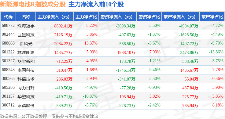 资金流向方面,新能源电池R(480027)指数成份股当日主力资金净流出合计78.3亿元,游资资金净流入合计21.07亿元,散户资金净流入合计57.23亿元。成份股资金流向详情见下表: