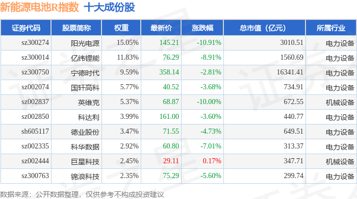 新能源电池R(480027)指数十大成份股详情如下: