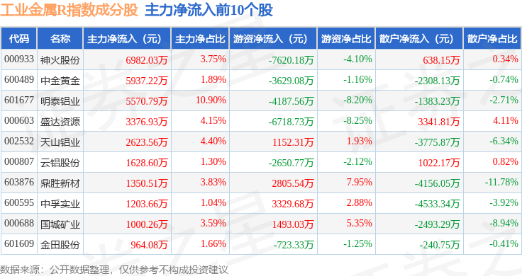 资金流向方面,工业金属R(480043)指数成份股当日主力资金净流出合计35.83亿元,游资资金净流入合计4.86亿元,散户资金净流入合计30.97亿元。成份股资金流向详情见下表: