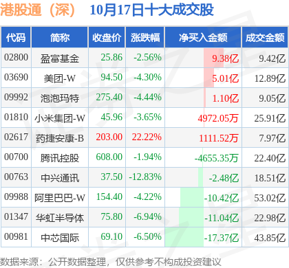 证券之星消息,10月17日,恒生指数跌2.48%,报收25247.1点。当日南向资金净买入63.027亿港元,交易所公布的港股通(深)十大成交股中,净买入个股共5只,净买入金额最多的是盈富基金,净买入9.38亿港元,净卖出个股共5只,净卖出金额最多的是中芯国际,净卖出17.37亿港元。详情可见下表: