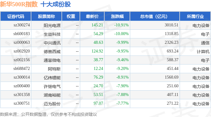 证券之星消息,10月17日,新华500R(489001)指数报收于7313.48点,跌2.35%,成交7476.11亿元,换手率0.93%。当日该指数成份股中,上涨的有49家,华天科技以10.02%的涨幅领涨,下跌的有444家,阳光电源以10.91%的跌幅领跌。