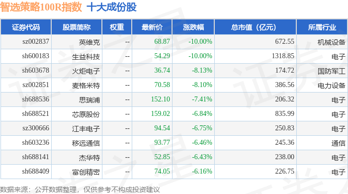 证券之星消息,10月17日,智选策略100R(489015)指数报收于4712.27点,跌3.62%,成交1636.61亿元,换手率1.85%。当日该指数成份股中,上涨的有8家,一品红以3.21%的涨幅领涨,下跌的有92家,英维克以10.0%的跌幅领跌。