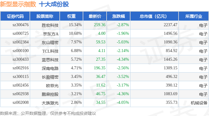 证券之星消息,10月17日,新型显示(970048)指数报收于1768.81点,跌3.46%,成交466.84亿元,换手率2.43%。当日该指数成份股中,上涨的有2家,聚灿光电以5.03%的涨幅领涨,下跌的有48家,晶瑞电材以9.93%的跌幅领跌。