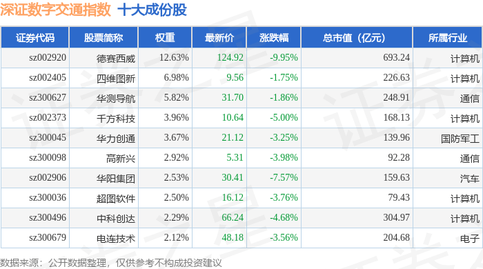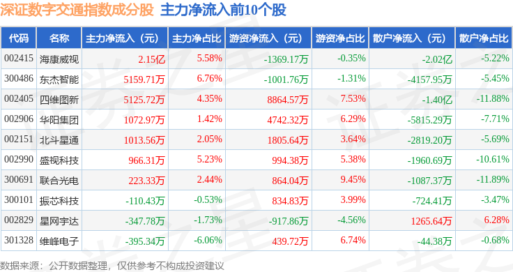 资金流向方面,深证数字交通(970049)指数成份股当日主力资金净流出合计15.22亿元,游资资金净流入合计6.96亿元,散户资金净流入合计8.26亿元。成份股资金流向详情见下表: