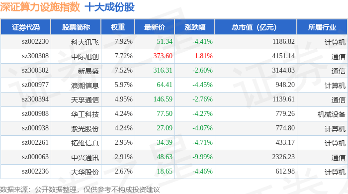 资金流向方面,深证算力设施(970051)指数成份股当日主力资金净流出合计57.54亿元,游资资金净流入合计17.86亿元,散户资金净流入合计39.69亿元。成份股资金流向详情见下表:
