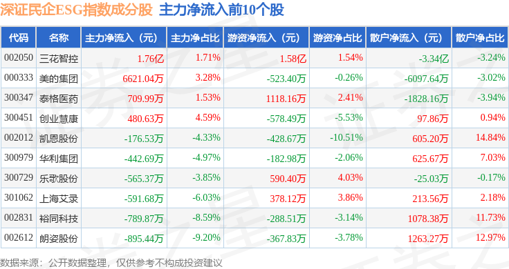 资金流向方面,深证民企ESG(970056)指数成份股当日主力资金净流出合计120.06亿元,游资资金净流入合计40.56亿元,散户资金净流入合计79.49亿元。成份股资金流向详情见下表: