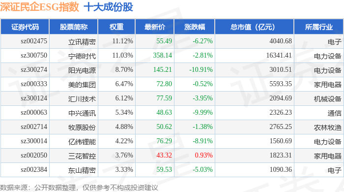 证券之星消息,10月17日,深证民企ESG(970056)指数报收于1965.67点,跌4.7%,成交1228.03亿元,换手率2.6%。当日该指数成份股中,上涨的有3家,三花智控以0.93%的涨幅领涨,下跌的有47家,盛弘股份以12.95%的跌幅领跌。