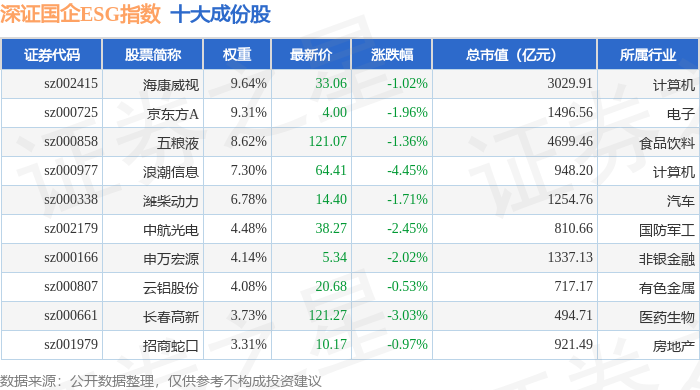 资金流向方面,深证国企ESG(970055)指数成份股当日主力资金净流出合计30.53亿元,游资资金净流入合计6.4亿元,散户资金净流入合计24.13亿元。成份股资金流向详情见下表:
