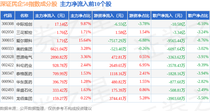 资金流向方面,深证民企50(970057)指数成份股当日主力资金净流出合计145.24亿元,游资资金净流入合计44.78亿元,散户资金净流入合计100.46亿元。成份股资金流向详情见下表: