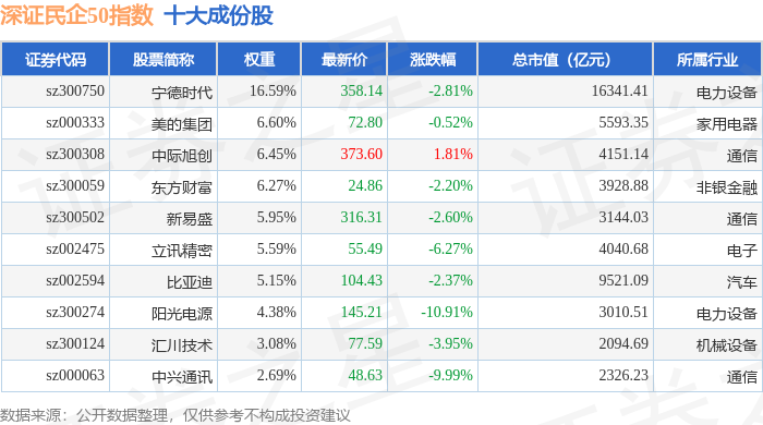 证券之星消息,10月17日,深证民企50(970057)指数报收于3157.77点,跌3.29%,成交1679.02亿元,换手率2.26%。当日该指数成份股中,上涨的有7家,中际旭创以1.81%的涨幅领涨,下跌的有42家,阳光电源以10.91%的跌幅领跌。