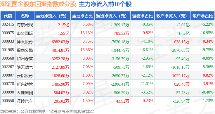资金流向方面,深证国企股东回报(970064)指数成份股当日主力资金净流出合计29.04亿元,游资资金净流入合计7.67亿元,散户资金净流入合计21.37亿元。成份股资金流向详情见下表: