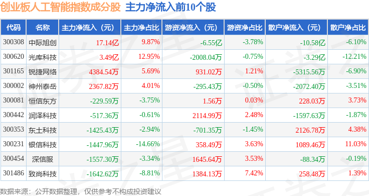 资金流向方面,创业板人工智能(970070)指数成份股当日主力资金净流出合计25.84亿元,游资资金净流入合计4.49亿元,散户资金净流入合计21.35亿元。成份股资金流向详情见下表: