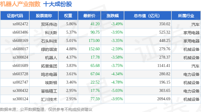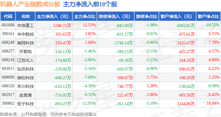 资金流向方面,机器人产业(980022)指数成份股当日主力资金净流出合计27.44亿元,游资资金净流入合计7.29亿元,散户资金净流入合计20.15亿元。成份股资金流向详情见下表: