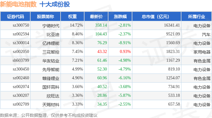资金流向方面,新能电池(980032)指数成份股当日主力资金净流出合计84.97亿元,游资资金净流入合计16.28亿元,散户资金净流入合计68.7亿元。成份股资金流向详情见下表: