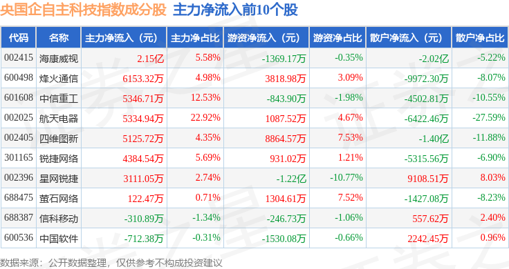 资金流向方面,央国企自主科技(980083)指数成份股当日主力资金净流出合计66.97亿元,游资资金净流入合计34.3亿元,散户资金净流入合计32.66亿元。成份股资金流向详情见下表:
