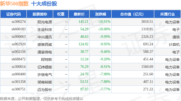 证券之星消息,10月17日,新华500(989001)指数报收于4972.93点,跌2.37%,成交7476.11亿元,换手率0.93%。当日该指数成份股中,上涨的有49家,华天科技以10.02%的涨幅领涨,下跌的有444家,阳光电源以10.91%的跌幅领跌。