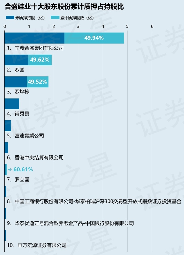 截止本公告日,股东宁波合盛集团有限公司已累计质押股份2.43亿股,占其持股总数的49.94%,股东罗燚已累计质押股份9552.06万股,占其持股总数的49.62%,股东罗烨栋已累计质押股份8884.35万股,占其持股总数的49.52%,股东罗立国已累计质押股份640.0万股,占其持股总数的60.61%。本次质押后合盛硅业十大股东的累计质押股份占持股比例(占持股比例的计算以公司最新一期财务报表公布的十大股东的持股总数为基准)见下图: