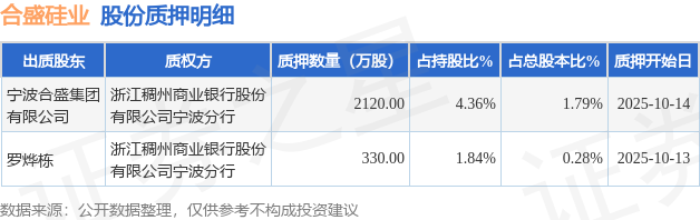 证券之星消息,合盛硅业(603260)10月17日公开信息显示,股东宁波合盛集团有限公司、罗烨栋向浙江稠州商业银行股份有限公司宁波分行合计质押2450.0万股,占总股本2.07%。质押详情见下表:
