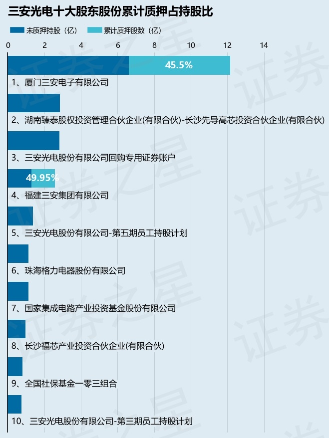 截止本公告日,股东厦门三安电子有限公司已累计质押股份5.52亿股,占其持股总数的45.5%,股东福建三安集团有限公司已累计质押股份1.28亿股,占其持股总数的49.95%。本次质押后三安光电十大股东的累计质押股份占持股比例(占持股比例的计算以公司最新一期财务报表公布的十大股东的持股总数为基准)见下图: