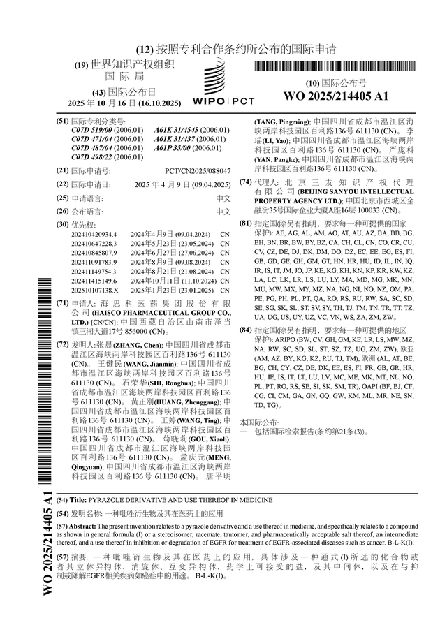 证券之星消息,根据企查查数据显示海思科(002653)公布了一项国际专利申请,专利名为“一种吡唑衍生物及其在医药上的应用”,专利申请号为PCT/CN2025/088047,国际公布日为2025年10月16日。