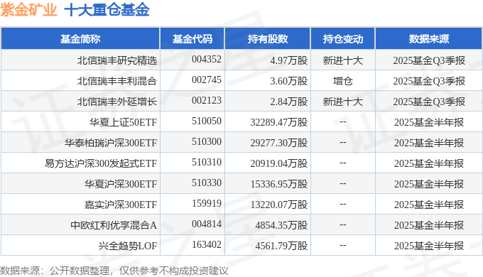 持有紫金矿业最多的基金为北信瑞丰研究精选,目前规模为0.19亿元,最新净值1.6371(10月17日),较上一交易日下跌2.13%,近一年下跌15.2%。该基金现任基金经理为胡健强。