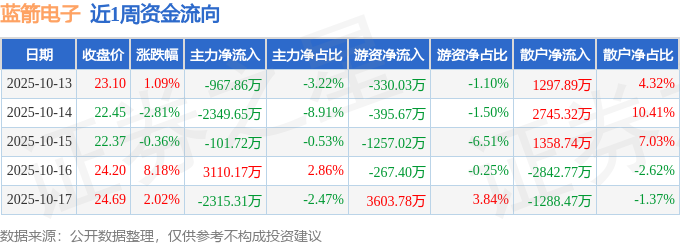 资金流向数据方面,本周蓝箭电子主力资金合计净流出2624.37万元,游资资金合计净流入1353.66万元,散户资金合计净流入1270.71万元。本周资金流向一览见下表: