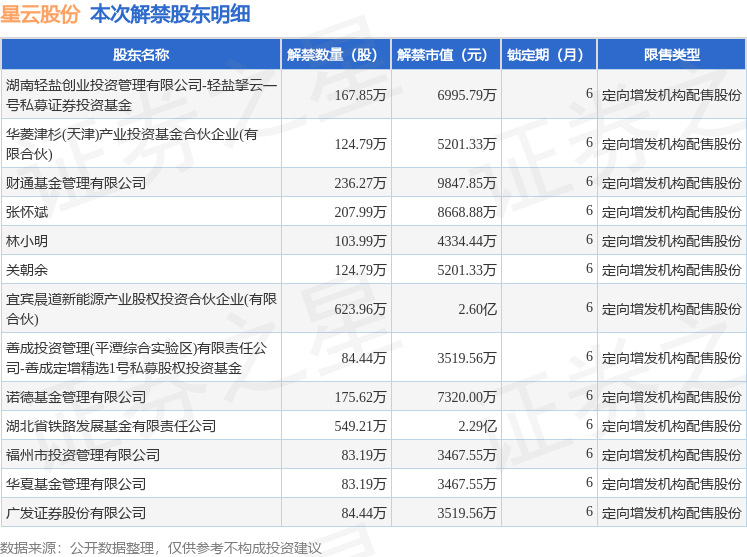 证券之星消息,根据市场公开信息整理,星云股份(300648)于10月20日将有2649.75万股限售股份解禁,为公司定向增发机构配售股份,占公司总股本15.2%。(本次数据根据历史公告整理得出,实际情况以上市公司最新公告为准)本次解禁后,公司还有4159.45万股限售股份,占总股本23.87%。具体如下图所示: