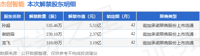 证券之星消息,根据市场公开信息整理,杰创智能(301248)于10月20日将有1075.65万股限售股份解禁,为公司追加承诺限售股份上市流通,占公司总股本7.0%。(本次数据根据历史公告整理得出,实际情况以上市公司最新公告为准)本次解禁后,公司还有4137.63万股限售股份,占总股本26.92%。具体如下图所示: