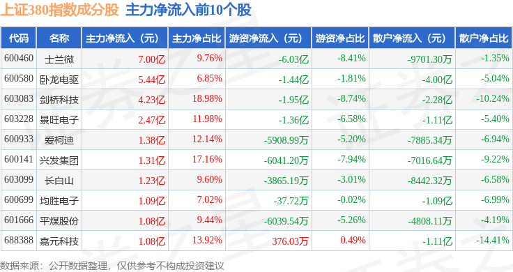 资金流向方面,上证380(000009)指数成份股当日主力资金净流入合计1.91亿元,游资资金净流出合计19.33亿元,散户资金净流入合计17.42亿元。成份股资金流向详情见下表: