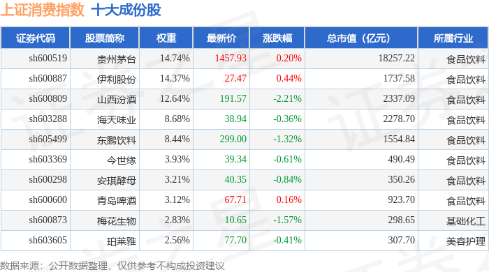 上证消费(000036)指数十大成份股详情如下: