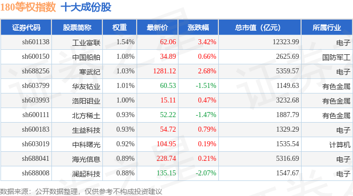 证券之星消息,10月20日,180等权(000051)指数报收于9222.01点,涨0.22%,成交2654.62亿元,换手率0.53%。当日该指数成份股中,上涨的有97家,潞安环能以7.23%的涨幅领涨,下跌的有81家,山东黄金以6.34%的跌幅领跌。