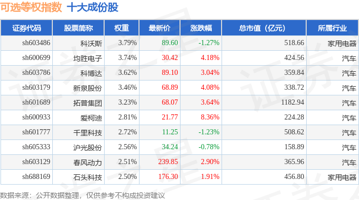 证券之星消息,10月20日,可选等权(000073)指数报收于3453.11点,涨0.8%,成交259.3亿元,换手率1.06%。当日该指数成份股中,上涨的有26家,爱柯迪以8.36%的涨幅领涨,下跌的有24家,际华集团以2.85%的跌幅领跌。