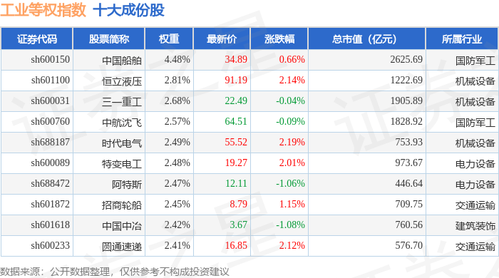 证券之星消息,10月20日,工业等权(000072)指数报收于2975.93点,涨0.38%,成交427.97亿元,换手率0.77%。当日该指数成份股中,上涨的有25家,中国东航以6.7%的涨幅领涨,下跌的有23家,隆基绿能以3.25%的跌幅领跌。