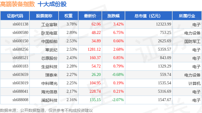 证券之星消息,10月20日,高端装备(000097)指数报收于10958.94点,涨0.88%,成交1408.2亿元,换手率1.48%。当日该指数成份股中,上涨的有36家,士兰微以8.65%的涨幅领涨,下跌的有23家,隆基绿能以3.25%的跌幅领跌。
