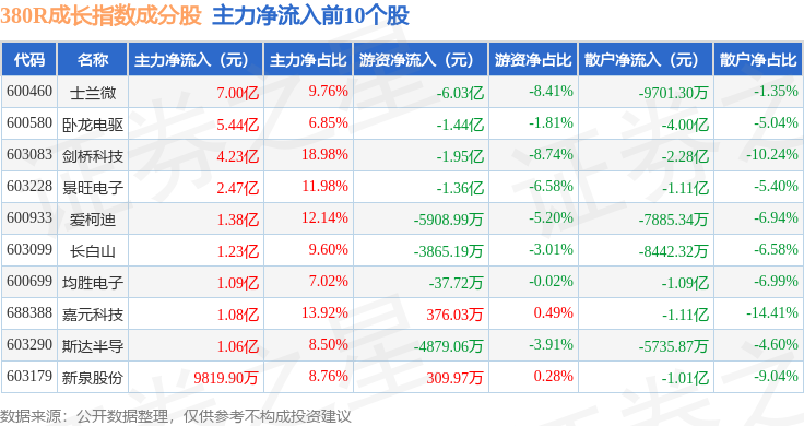 资金流向方面,380R成长(000119)指数成份股当日主力资金净流出合计1430.92万元,游资资金净流出合计16.82亿元,散户资金净流入合计16.96亿元。成份股资金流向详情见下表: