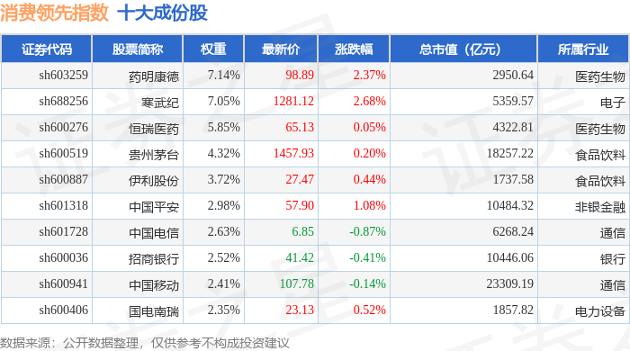 消费领先(000148)指数十大成份股详情如下: