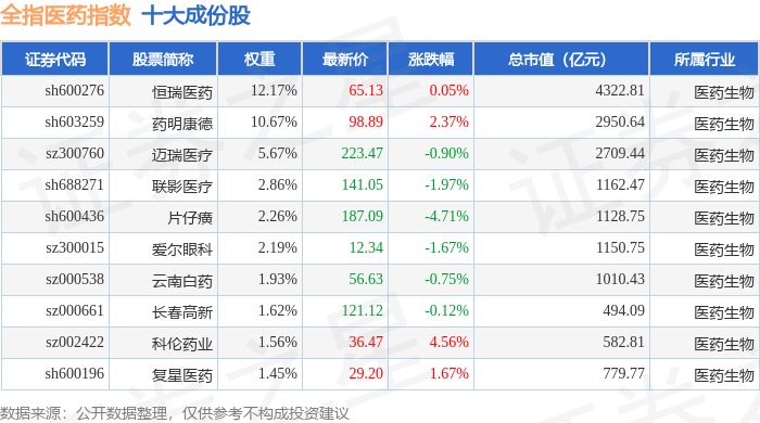 全指医药(000991)指数十大成份股详情如下: